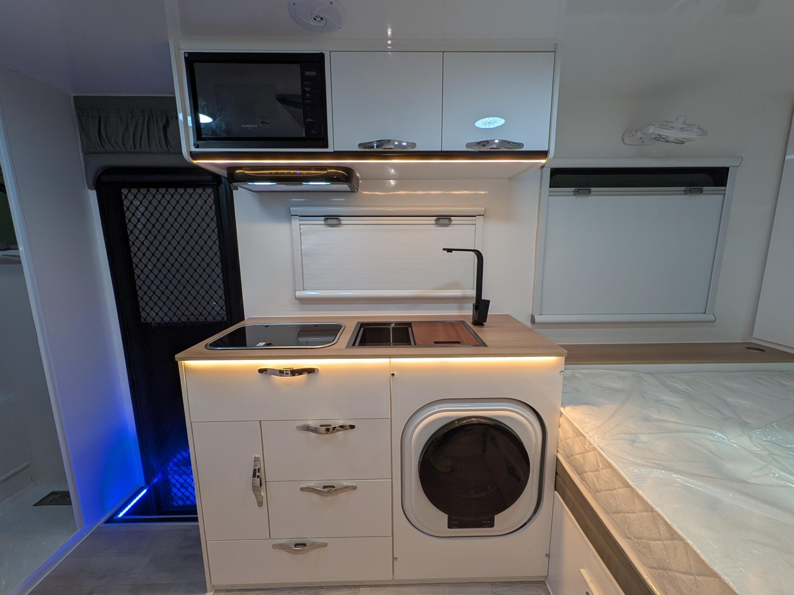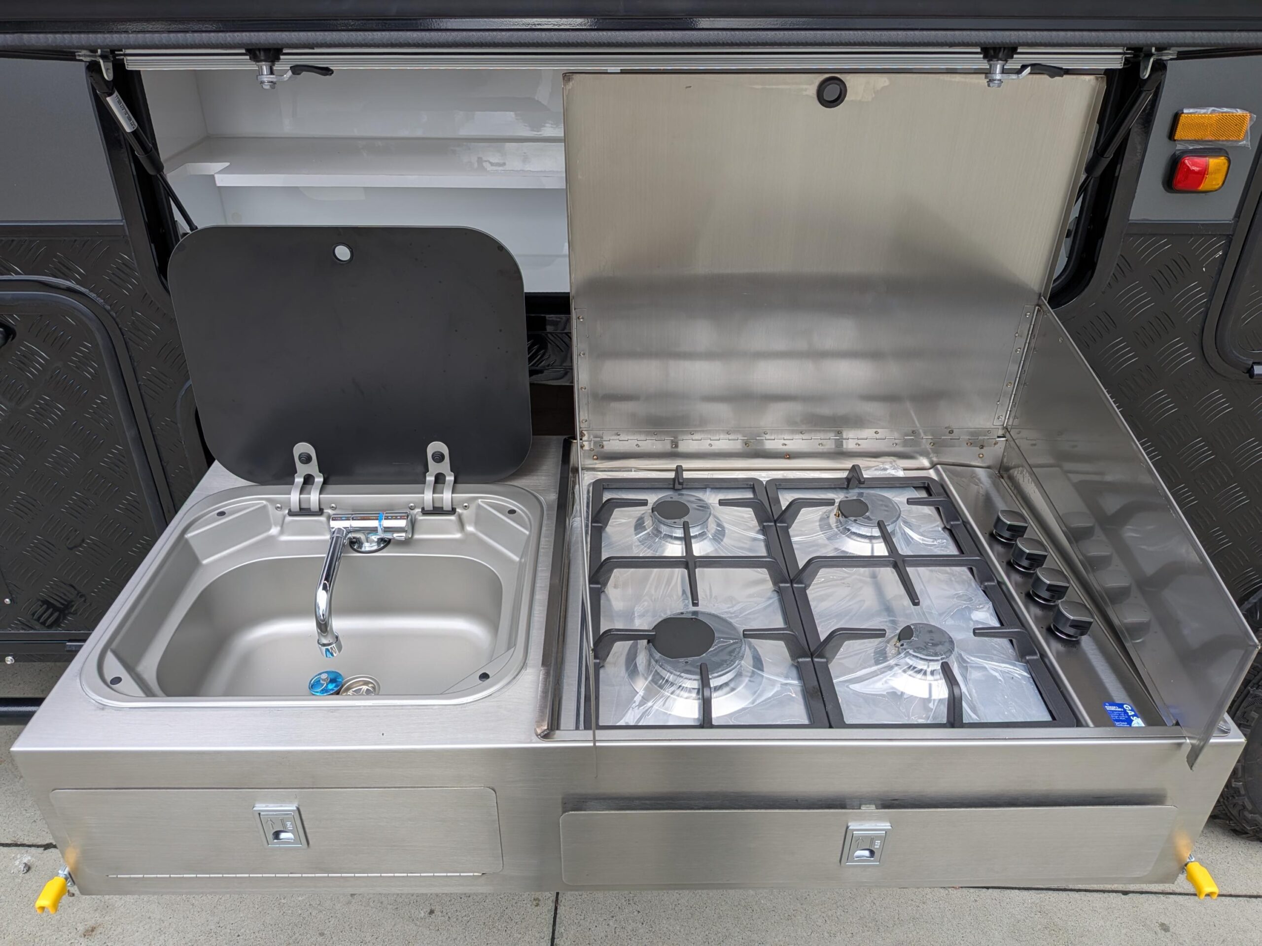 | Slide out kitchen | Compact Stainless Steel 4 Burner with Wind Deflector, Wash Basin, Cutlery Drawer and Drying Rack etc. |